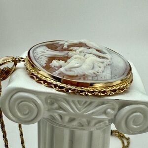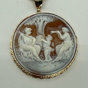 Beautiful and finely detailed vintage shell cameo pendant featuring an enchanting pastoral scene of a cherub presenting flowers to two seated female figures beneath a tree. The craftsmanship is delicate and deeply carved, creating impressive depth and texture.