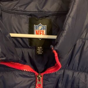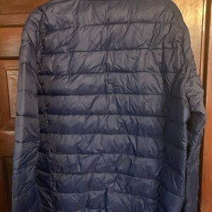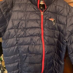 Stylish blue puffer jacket with red zipper and logo accents. Perfect for casual wear.