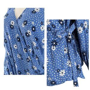 Talbots Plus 1X Blue White Floral Daisey Faux Wrap V Neck Blouse Cottage Boho