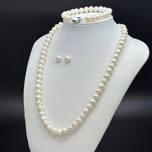 This elegant pearl jewelry set features a stunning necklace bracelet, and earrings. The classic white pearls add a touch of sophistication to any outfit Classic off-round pearl necklace set includes 20 inches 7-8mm pearl necklace, approx 7.5-8 inches pearl bracelet and 7-8mm pearl stud earrings. 925 sterling silver pea clasp. This trendy and gorgeous pearl jewelry set arrives with a luxury velvet-covered gift box. Perfect for any occasion. NWT