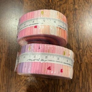 Vibrant Moda jelly roll fabric bundle. Features shades of pink, purple, and red. Perfect for quilting projects.
