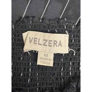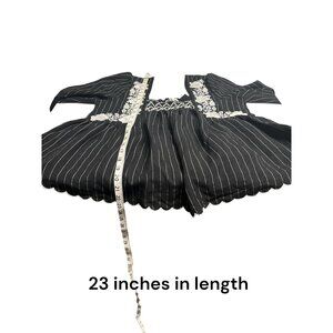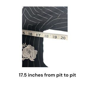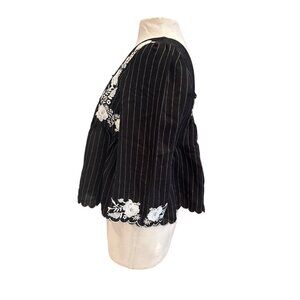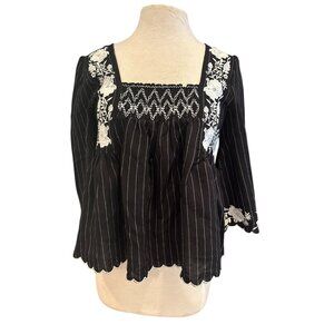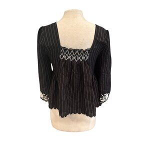 Velzera Womens Black Pinstripe Top W/ White Floral Embroidery & Smocked Details