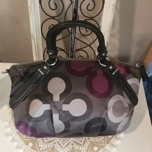 Stylish and versatile, this Coach bag features a striking purple and black design. Perfect for any occasion, it combines elegance with functionality. Coach Sophia Madison Women's Purple and Black Satchel Bag Preowned condition signs of wear. Vintage bag in good condition considering age spots and signs of wear on exterior could possibly be cleaned. Interior is dirty and I think there is possibly a nail polish stain and ink stains which are probably permanent. I try my best to photograph spots and wear I may miss some because bag is Vintage. See photos.