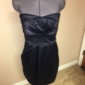 Super cute strapless cocktail dress. Short. Tie bow in back. Zip Up back. Satin feel material. Not a lot of stretch. Used but in very good condition.