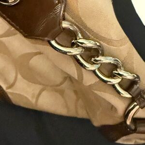 Used vintage coach purse. Zipper is coming apart in one area. Can have it replaced. Coach Carly hobo bag brown monogram jacquard classic shoulder purse.