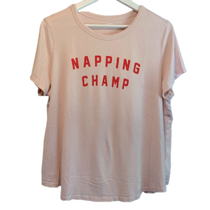 Stay cozy and stylish with the Napping Champ pink t-shirt. Perfect for casual days.
