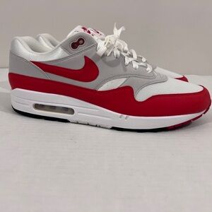 Nike Air Max 1 sneakers in red and white. Stylish and comfortable.
