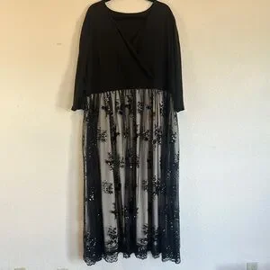 This elegant dress features a sophisticated black top with a flowing cream floral skirt. Perfect for any occasion, it combines style and comfort effortlessly.