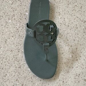 Step out in style with these elegant Tory Burch sandals. Featuring a chic gray color, these sandals are perfect for any occasion. Enjoy comfort and fashion with every step.