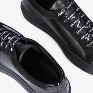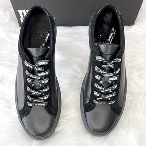 Brand New Black leather w/ vinyl low-top sneakers. Super casual and trendy. Minor storage markings. Box has some minor damage has been taped.