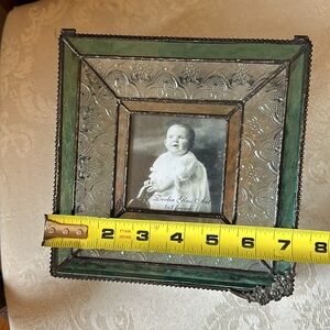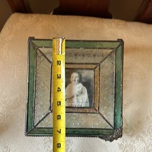 NWT J. Devlin glass art keepsake, jewel box, trinket box from Von Maur features beautiful textured leaded stained glass and spot for 3 x 3” photo. Green stained glass is partnered with Victorian textured clear glass and the bottom has an opalescent glow. Measures approximately 7.25 x 7”, with a titled height. See photos for full measurements.
