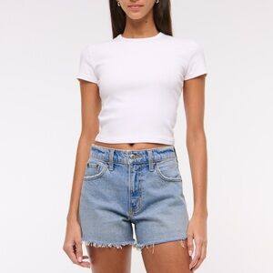 High rise 90's-style denim with a looser fit through the leg and more room through the hip and thigh, and a 3.25 inch (8.25 cm) inseam. Vintage stretch denim in a medium wash, with zipper fly and frayed hem.