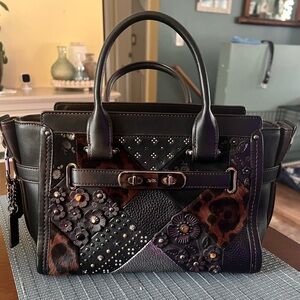 This Coach satchel combines a sleek black and brown color palette with a structured design, perfect for any occasion. Crafted from high-quality leather, it features intricate textures and finishes, including studded embellishments and quilted patterns. The bag is completed with a stylish metal clasp, offering both elegance and security.