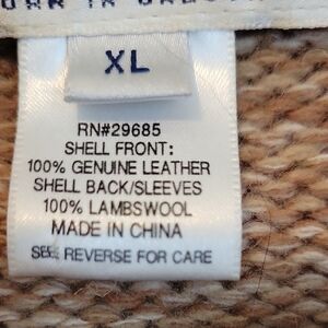 Stylish tan suede jacket featuring unique patterned sleeves. Perfect for a chic look.