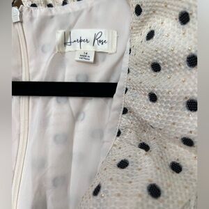 It has pockets! New with tags. Gorgeous spring and summer dress! This Harper Rose polka dot fit & flare dress is a chic and feminine piece featuring a structured silhouette with a playful yet sophisticated design. The dress is made from a blend of polyester, cotton, and metallic fibers, giving it a subtle shimmer. It has a ruffled neckline, a button-up front, and pleated detailing at the waist, creating a flattering fit. See pictures for details. Make an offer, or bundle your favorites! According to original Nordstrom website, it states the dress is Ivory & Navy. The dots are very very dark navy.