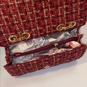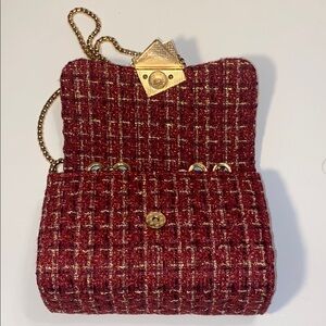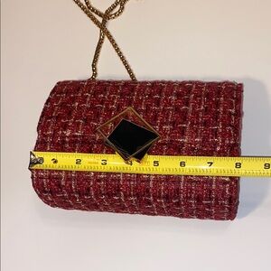 This chic red tweed bag features a stylish chain strap and a unique geometric accent. Perfect for adding a touch of elegance to any outfit.
