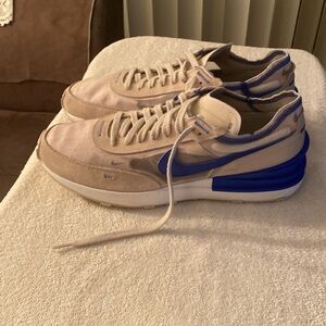 Experience the perfect blend of style and performance with these Nike athletic shoes. Featuring a striking blue and white color scheme, these shoes are designed for both comfort and agility. Ideal for running or casual wear, they offer a sleek silhouette and a modern aesthetic. Excellent Condition