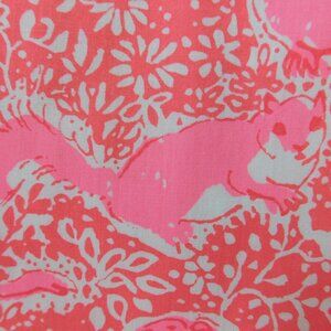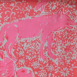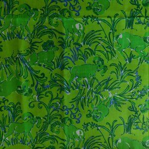 All over design is hand screened in hues of kelly and pine, accented w/ arctic & cobalt on a chartreuse base.