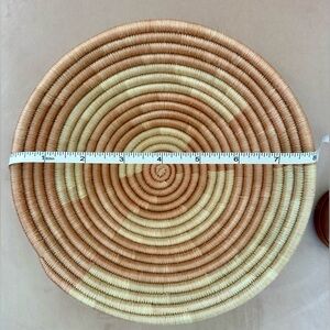 Round shallow decorative basket made by hand in Uganda. Excellent condition.