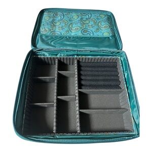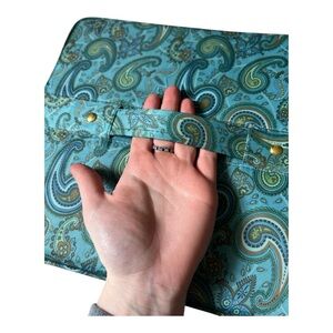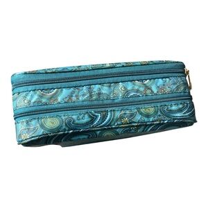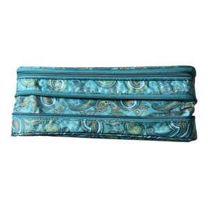 Beautiful vintage-style jewelry travel case with an elegant paisley pattern in shades of blue and green.