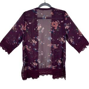 Excellent preowned condition. Burgundy floral print lightweight 3/4 sleeve sheer open kimono blouse. Has crochet trim. Has 9" slit up each side. Blouse is polyester, crochet trim is 100% cotton material. Approx. measurements: Shoulder to hem 30", pit to pit 22", sleeve from neck to sleeve hem 21". Size S.
