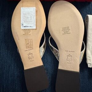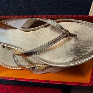 Elegant Tory Burch sandals in gold. Perfect for any occasion. New in box with dust bag. Never worn. Stickers attached. Purchased from Bloomingdale’s. Classic flip flop with metallic gold leather.