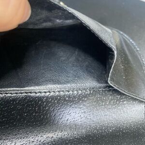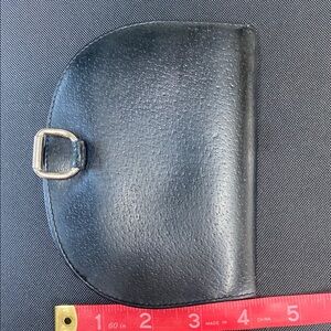 Rare vintage Gucci R-Shape black leather wallet with silver hardware. Minor wear in the leather bumper on clasp, some oxidation on inside hardware clasp. No other call outs.