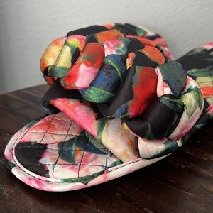 Level up your loungewear and show off that pedicure with Nine West's vibrant floral slide sandals. The soft, satiny fabric is machine washable. Non-slip soles can be worn outside. Perfect for adding a pop of color to any outfit, spring, summer, or fall.