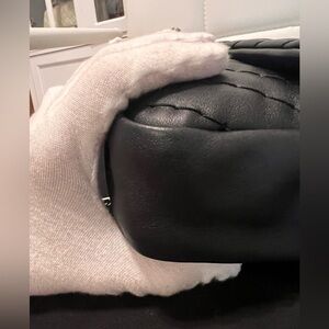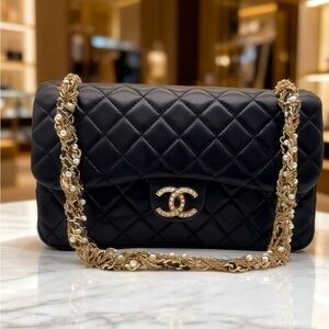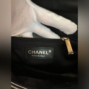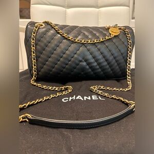 Elegant Chanel bag in black quilted leather with gold accents. Perfect for any occasion.