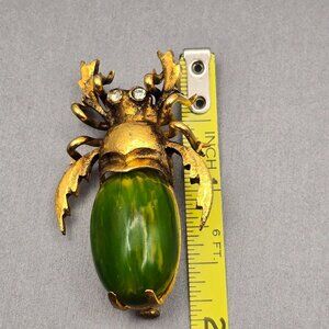 Art Deco Gold-Tone Beetle Brooch Green Bakelite Body Crystal Eyes Trombone Clasp