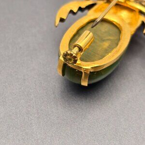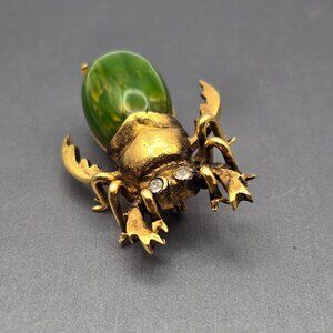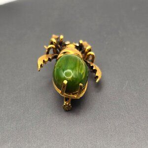 This art deco brooch combines a striking beetle design with a jelly belly green marbled body and rhinestone eye accents, creating a sophisticated accessory for collectors or vintage jewelry enthusiasts.