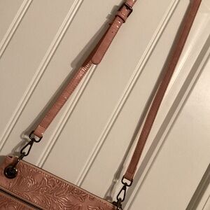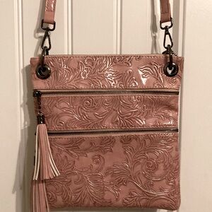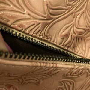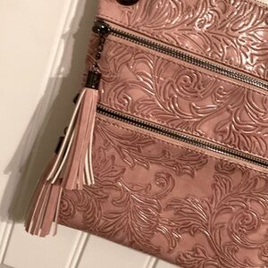 Pink shoulder bag, with beautiful design working in faux leather. It has lot of departments. Three zippers On outside with cute tassels. The bag zips at top. Approx measurements 101/2” / 9”. Smoke free environment , great condition, clean on inside and out. Any questions please ask. Thank you.