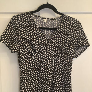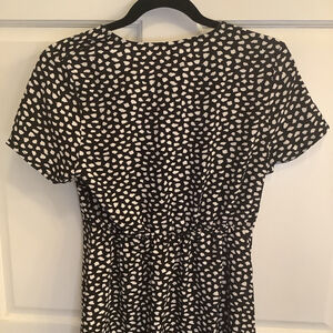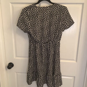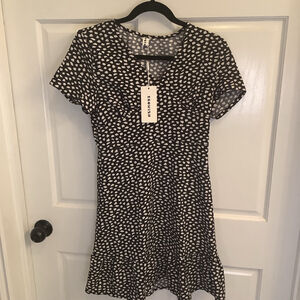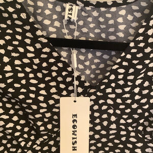 This is a new with tags and box, black and white polka dot dress by the brand Ecowish. It is a size M and is made of 65% cotton and 35% polyester. The dress has a V-neck, short sleeves, and a ruffled hem. It measures approximately 18 inches pit to pit 14 inches across the waist, 34 inches from shoulder to hem, . The dress is in excellent condition with no visible imperfections.
