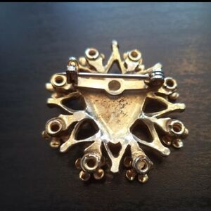 The back features a secure pin clasp in excellent working condition. The brooch appears to be in excellent vintage condition, showing minimal signs of wear with vibrant enameling and securely set stones.