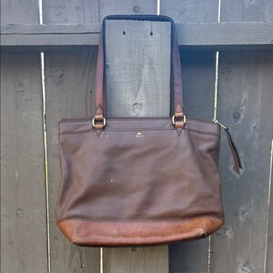 This genuine leather tote is structurally in great condition it looks like it was attempted to be dyed, but didn’t turn out great. I’ve cleaned it with an all over leather cleaner and conditioner but it could use a darker dye job with this it would look brand new!