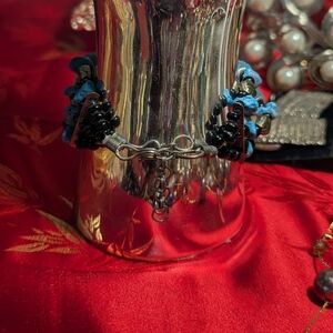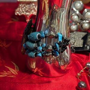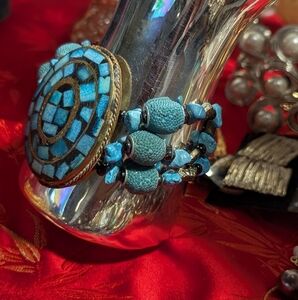 Vintage Brass & Inlay Faux Turquoise Oval Shaped Statement Bracelet. Can fit size 7in wrist up to 8 1/2in. please see pictures for better description. All sales are final! Happy shopping! ๐
