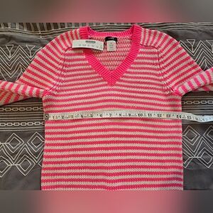 Brand new with tags. Size XXS. Pink and cream striped. Vneck style. Cable knit. Ribbed detailing on cuffs, hem and neckline. Measurements and fabric content listed above in pictures.