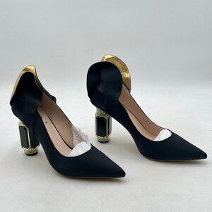 FSJ Black Satin Pumps Pointed Toe Crystal Chunky Block High Heels Slip On Curly Back Wedding Dress Evening Shoes