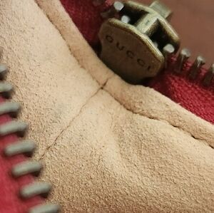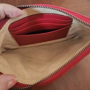 Authentic GUCCI Matelasse GG Marmont pouch is crafted of smooth and supple red calfskin leather. This bag features a wrist strap and top zip closure. The front of the pouch has an aged silver tone GG logo and opens to a beige microfiber lining with a suede like finish and card slots. Measures approx. 7.75”x1”x4.75”. Item is in pre-owned, excellent condition. Makes a great gift!