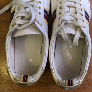 White leather lace up tennis shoe with gold grommets and multi color ribbon stripe side detail. In great condition.