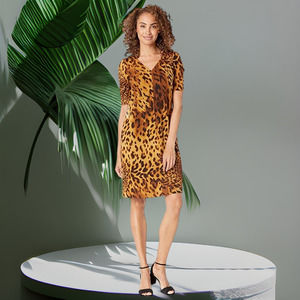 TOMMY BAHAMA Serengeti Spots Dress Size S/P Color Monzo Wood. Richly-hued animal spots enliven a V-neck dress with plenty of stretch for a shapely profile. 3/4 sleeve. Slips on over head. V-neck. Three-quarter sleeves. 91% viscose, 9% spandex. Machine wash, tumble dry. Imported. Women's Clothing. Cute Casual Chic.