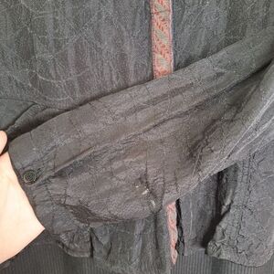 Textured blazer style long sleeve top with snap buttons and red floral / fern embroidered detail