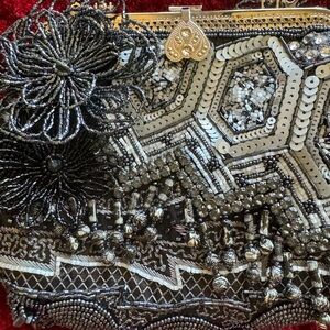 This beaded one of a kind cocktail bag is beyond stunning. Maybe used twice. Excellent condition. No beads missing. Comes with curved handle and a removable long chain. Silvertone hardware with a darling heart clasp. The pattern is intricate and is clearly one of a kind! Two inside pockets one zipped the other is a slide in. You will received compliments with this bag!!!