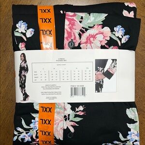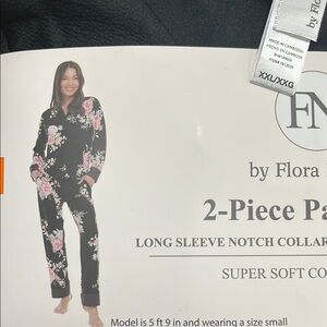Flora Nikrooz 2-piece pajama set in black with pink floral patterns. Features a long sleeve notch collar and pants with satin accents. Soft and comfortable.