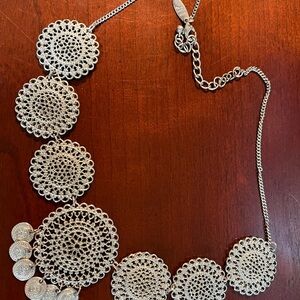 This elegant silver necklace features intricate circular designs, perfect for adding a touch of sophistication to any outfit.
