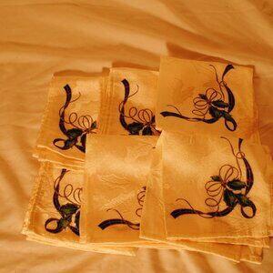 NEW LENOX HOLIDAY SET OF 6 SM 4 LG SATIN NAPKINS, PLACE MATS AND TABLE RUNNER. SM NAPKINS ARE 9INX9IN, LG NAPKINS ARE 20INX20IN. PLACE MATS ARE 19INX15IN, TABLE RUNNER IS 14X90 IN. ALL VERY NICE.