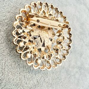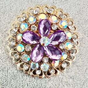 Round Gold Tone Purple Clear and Iridescent Rhinestone Floral Brooch Pin