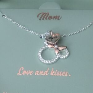 Elegant Disney necklace with 'Mom' pendant. Features silver and rose gold tones. Perfect gift for mothers.