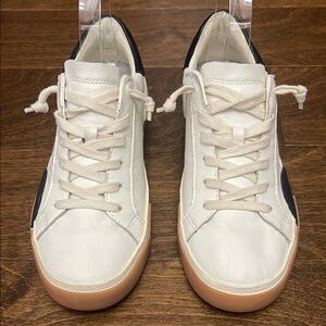 Stylish white sneakers featuring black accents and tan soles. Perfect for casual wear.
