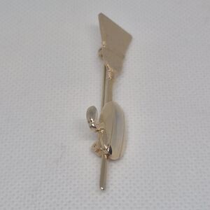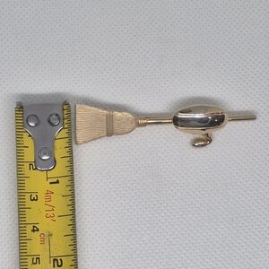 This gold tone curling brooch features a classic design of a curling rock and broom. Unsigned. Perfect for adding a touch of whimsy to any outfit.